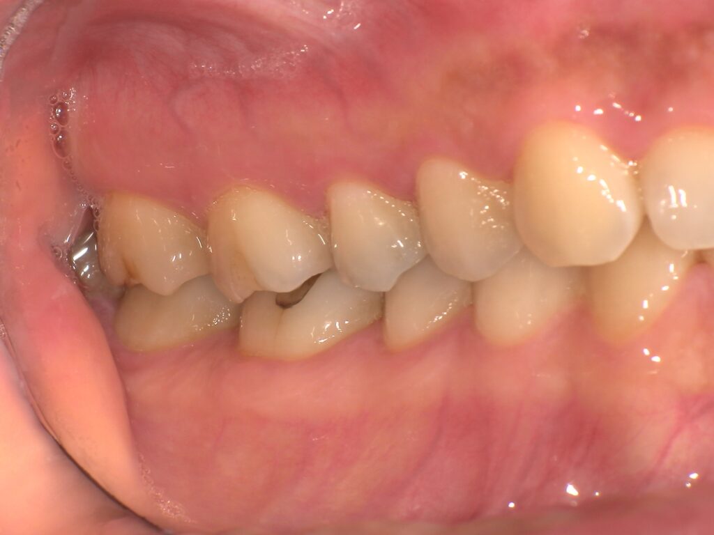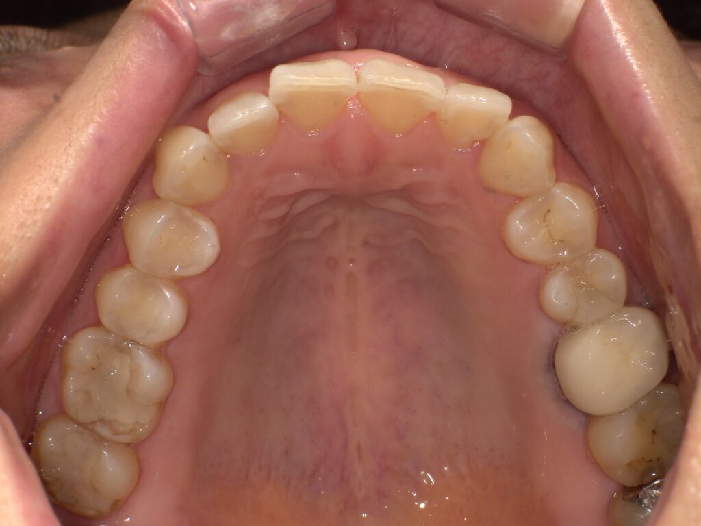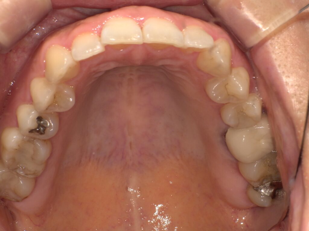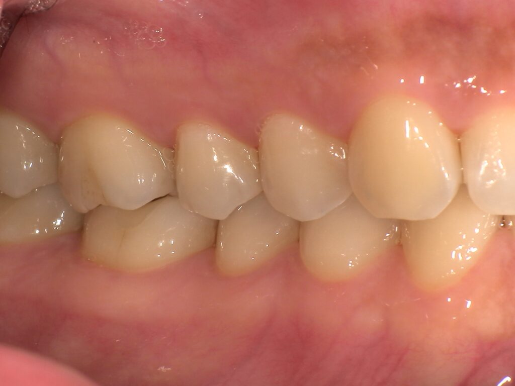 保険診療で作製できるCAD/CAM冠はプラスチック素材であるため、割れやすく、また吸水性があることから変色する可能性があります。そこで、白く自然な見た目で、強度にも優れたセラミック(e-max)を選択されました。